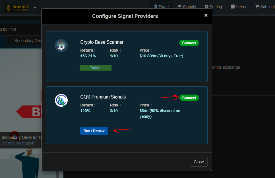Click on Signals from header menu then click on connect button and follow the steps of making the payment according to your preferred signal subscription duration. Once payment is complete then connect button will become connected. Once signal service is connected you will be able to use this signal to configure trigger orders as shown in next step.